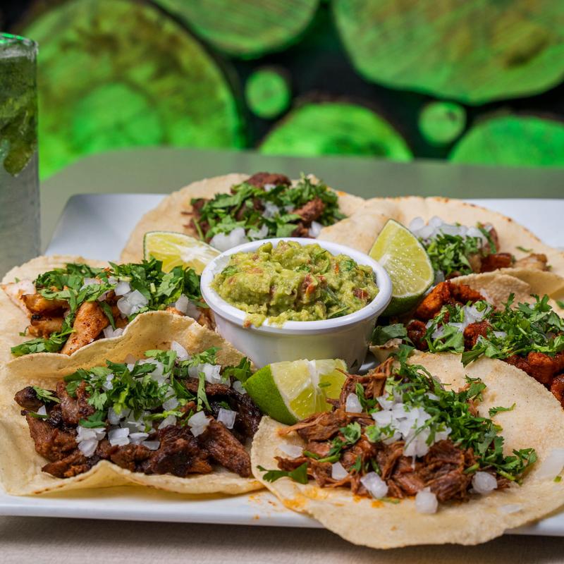3 tacos served with grated mozzarella cheese, guacamole, steak, and shrimp